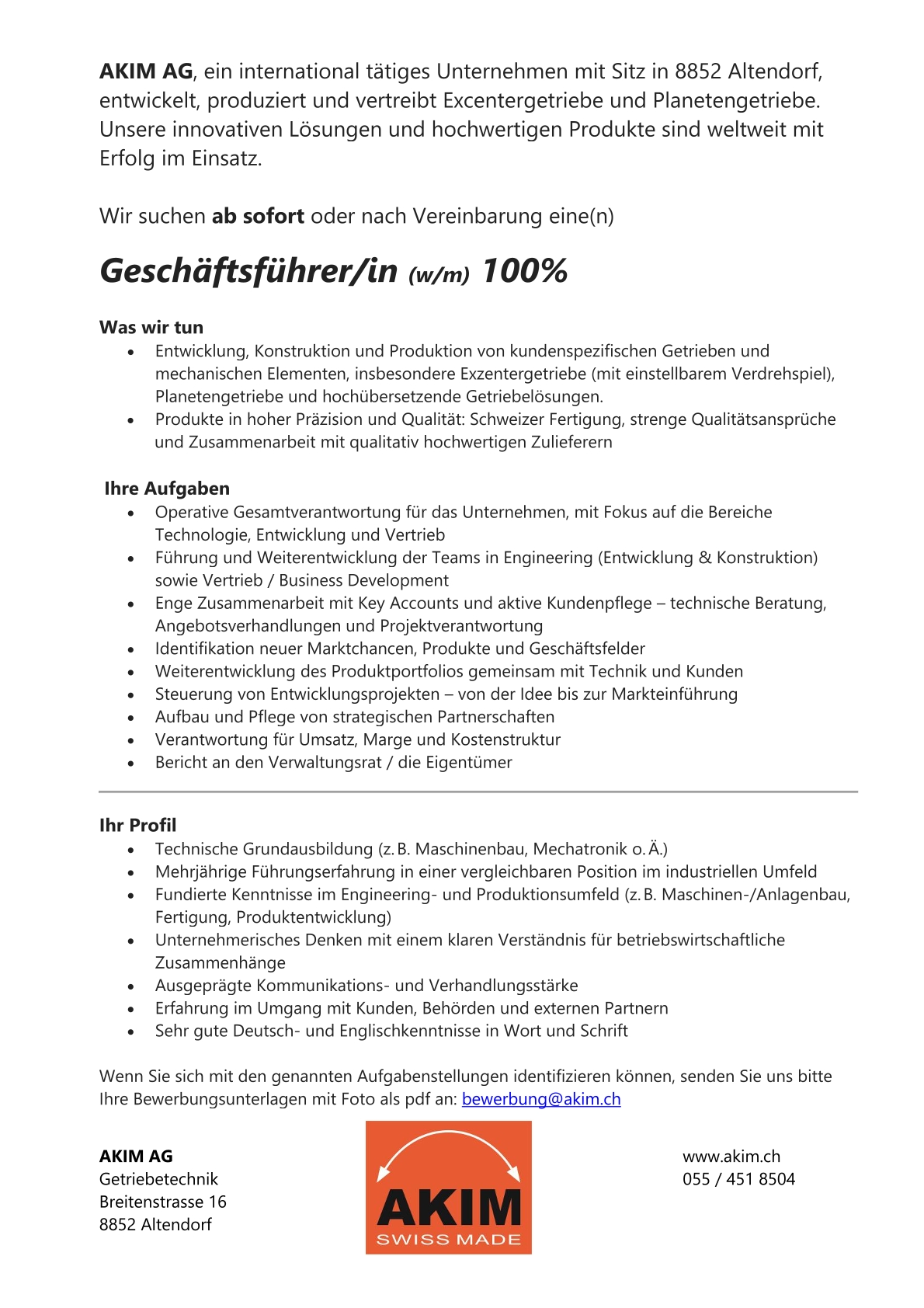 Leiter/in Konstruktion/Entwicklung (w/m) 100%